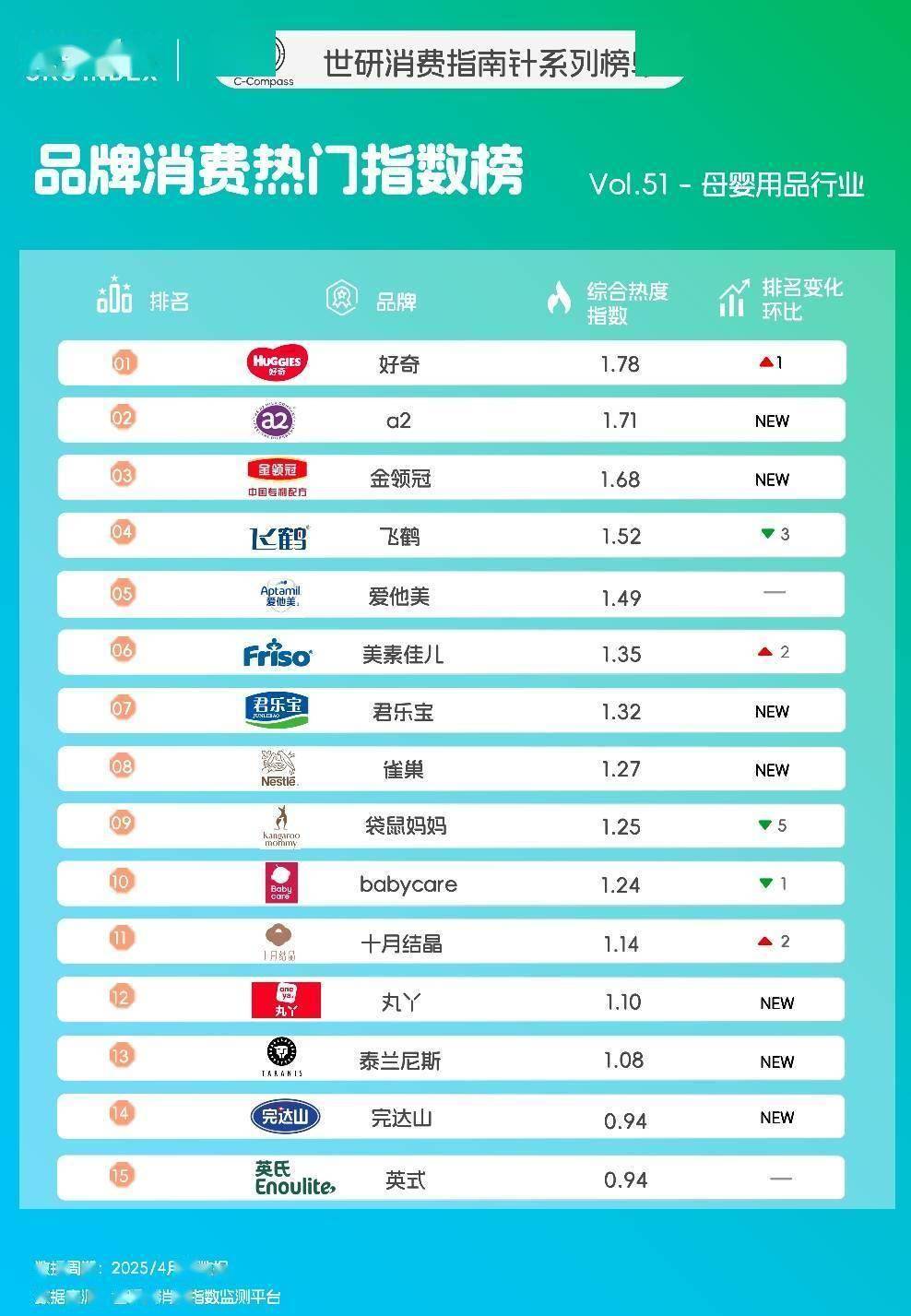 本次监测周期内,好奇、a2和金领冠分别以1.78、1.71和1.68的综合热度指数位列榜单Top3。